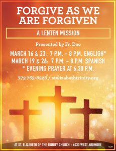 “Forgive As We Are Forgiven” – given by Fr. Deo on Mondays, March 16 & 23 in English at 7:00 p.m. and Thursdays, March 19 & 26 in Spanish at 7:00 p.m.